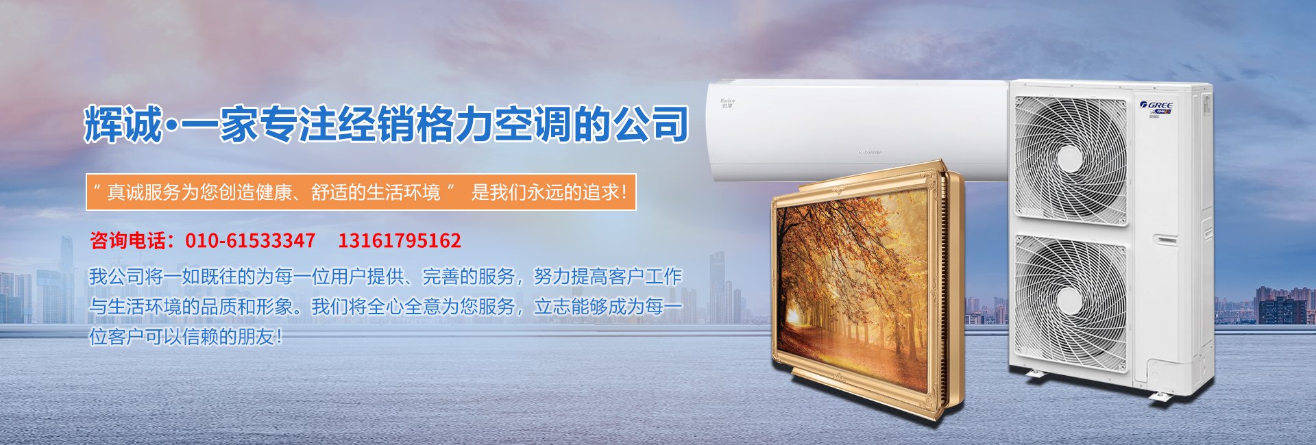 北京輝誠商貿有限公司  是一家專門以承接大、中、小型空調項目和家用空調的銷售、安裝和售后服務為一體的專業經銷格力空調的專業公司。公司現為珠海格力空調北京地區代理商。北京輝誠商貿有限公司  是一家專門以承接大、中、小型空調項目和家用空調的銷售、安裝和售后服務為一體的專業經銷格力空調的專業公司。公司現為珠海格力空調北京地區代理商。